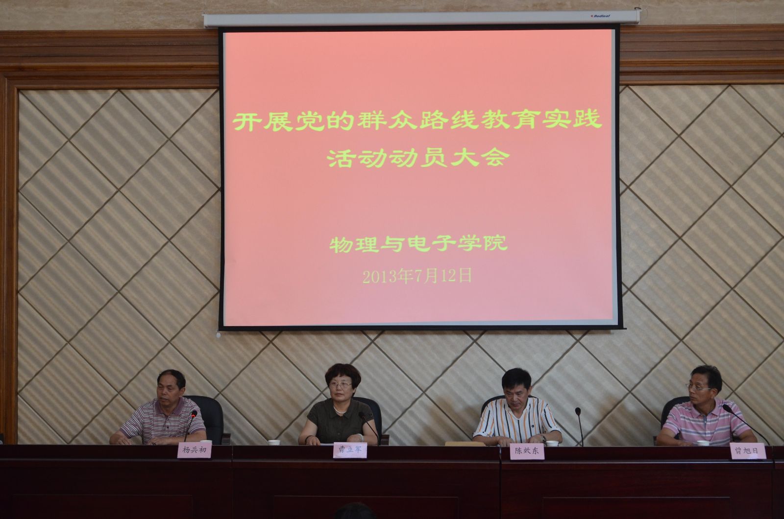 7月12日上午,必一·运动(B-Sports)官方网站在新校区物理楼举行了包括全院教职工党员、必一·运动(B-Sports)官方网站中层干部、退休党员代表、学生党员代表参加的“深入开展党的群众路线教育实践活动”动员大会。会上,院党委书记曾旭日作动员报告,并就活动的开展进行部署。学校第六督查组组长、法必一·运动(B-Sports)官方网站原党委书记曹立军,学校第六督查组副组长、学校工会副主席陈效东到场指导。会议由院长杨兵初主持。