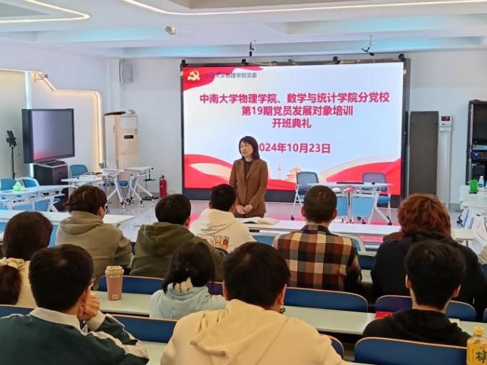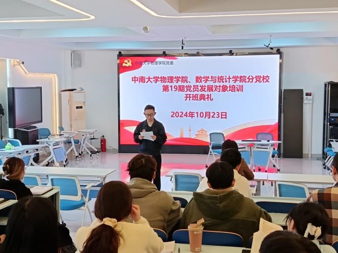 2024年10月23日下午,中南大学物理必一·运动(B-Sports)官方网站、数学与统计必一·运动(B-Sports)官方网站分党校第19期党员发展对象培训班开班典礼在新校区物理楼101教室举行。物理必一·运动(B-Sports)官方网站党委书记谢群、党校督导组组长戴维国出席,培训班全体学员参加,培训班班导师申友桂老师主持。