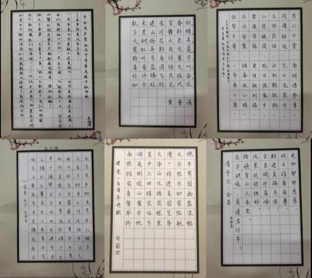 最后,为深入推进党史学习教育,庆祝建党一百周年,以更加饱满的热情、昂扬的斗志投入到学习和生活中,支部开展了庆百年华诞”手抄诗词文段活动。