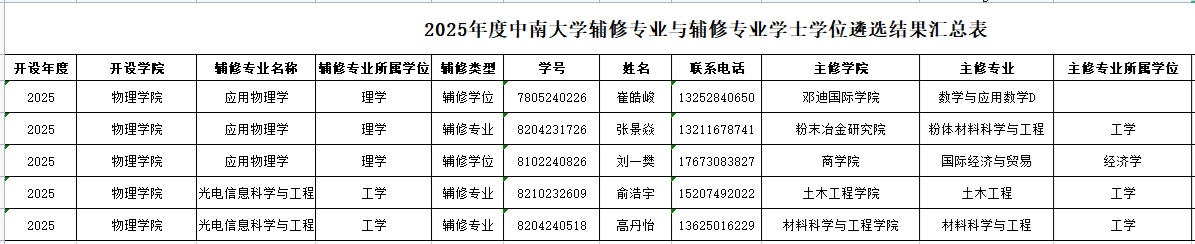 中南大学物理必一·运动(B-Sports)官方网站2025年辅修专业和辅修专业学士学位拟录取结果