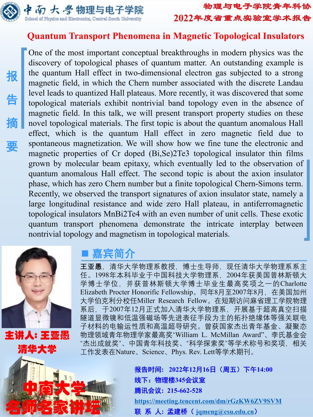 中南大学名师名家学术论坛-Quantum Transport Phenomena in Magnetic Topological Insulators