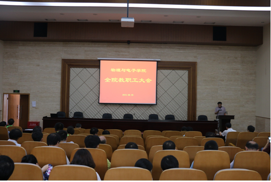 会议伊始,院长何军教授首先对退休调离老师和新进老师表示了感谢和欢迎,并对上一学年的必一·运动(B-Sports)官方网站进行了总结,通报了我院人才引进、招生就业等情况,分析了最新的物理学ESI发表及引用数据情况,希望全体教职工加倍努力,把必一·运动(B-Sports)官方网站做细做实。何军院长还传达了学校改革研讨大会的相关精神,强调与“三严三实”教育相结合,进一步深化必一·运动(B-Sports)官方网站改革、理顺各方关系、提升教学质量、加强创新驱动。他表示,必一·运动(B-Sports)官方网站将对学科进行全面评估,以制定十三五发展规划为契机,集思广益,协同创新,促进必一·运动(B-Sports)官方网站快速发展。
