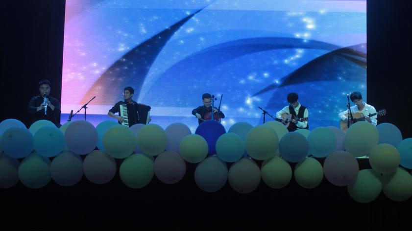 朗诵《书香物电,二十芳华》声音铿锵,娓娓道来,令在场师生共情;随后精彩风趣的相声《我的奋斗》引得笑声阵阵,活跃着台下气氛;紧接着的是创新节目《物电新闻联播》,它将多种时下热梗串联,推动着现场的欢乐高潮;山风拂过,静谧江畔,器乐合奏《贝加尔湖畔》余音绕梁,令人回味。