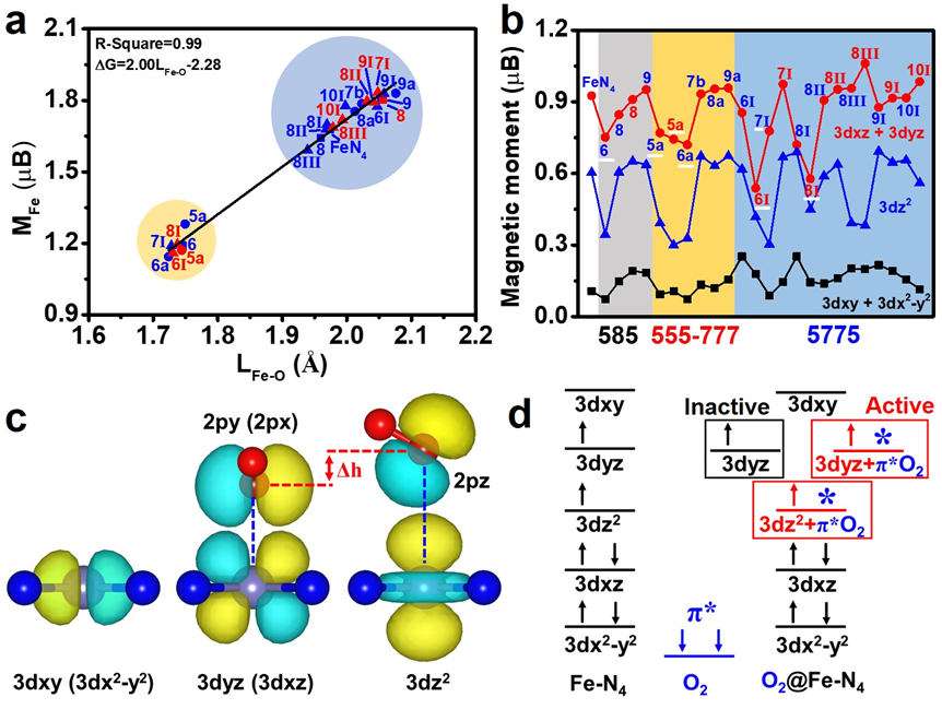 单原子Fe-N-C催化剂在氧还原反应(ORR)中受到了广泛的关注。然而,Fe-N-C催化剂的ORR反应活性的来源并不清楚,从而阻碍了Fe-N-C催化剂的进一步发展。因此,通过密度泛函理论计算,从前线轨道的空间分布和能级分布角度提供了理解Fe-N4位点ORR活性的模型。以双空位缺点调控单原子Fe-N4位点ORR活性为例,从电子结构上证明了Fe-N4位点氧还原反应活性的起源是Fe 3dz2、3dyz (3dxz)和O2π*轨道之间的杂化作用。数据拟合的结果表明Fe-O键长、自旋态d带中心间隙、Fe位点磁矩、O2*磁矩等描述符与单原子Fe-N4位点ORR活性之间具有近线性的关系,可以准确的预测Fe-N4位点的ORR活性。此外,这些描述符主要分布在两个差异明显的区域内,即活跃的Fe-N4位点和平庸的Fe-N4位点,这与Fe 3d投影轨道在Z方向的分布高度有密切的关系。这项必一·运动(B-Sports)官方网站为单原子M-N-C催化剂的ORR活性起源提供了新见解,为高性能单原子催化剂的设计提供了理论指导。