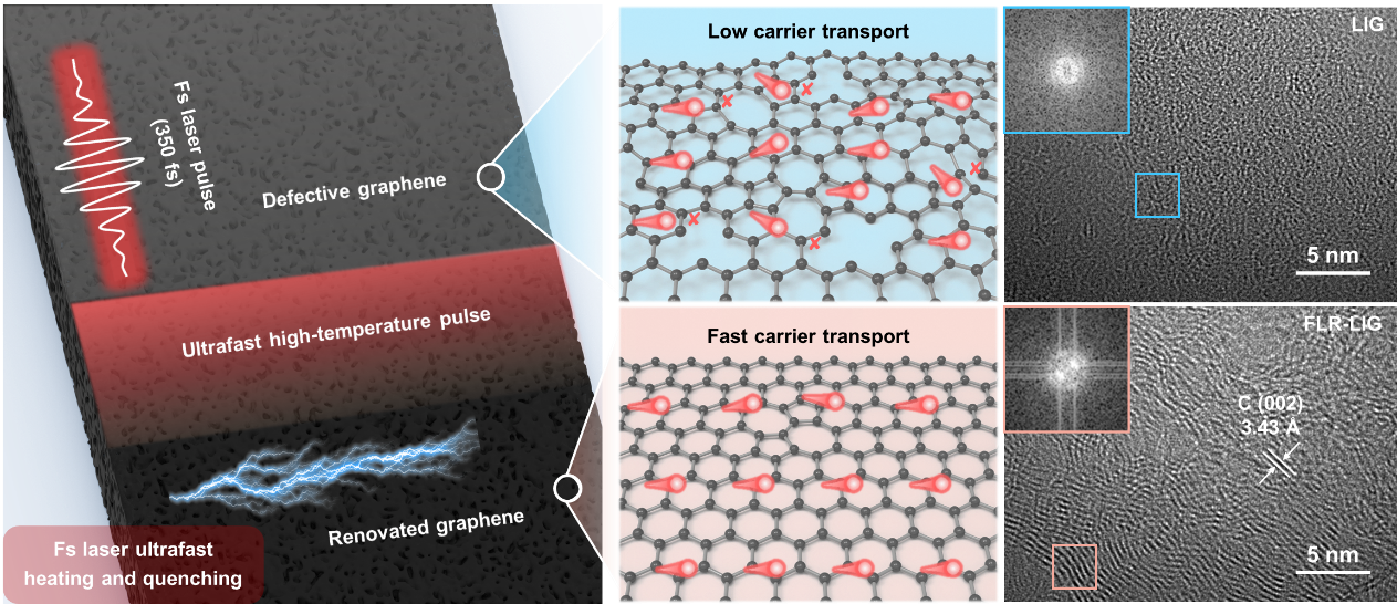 研究团队提出了一种飞秒激光超快原子尺度修复激光诱导石墨烯(LIG)的新策略。飞秒激光辐照LIG会产生超快高温光热脉冲,引发瞬时加热和冷却过程,这为碳原子重排提供了热力学和动力学条件,从而促进LIG中结构缺陷的修复。XPS分析证实,飞秒激光修复前后样品中sp2sp3杂化碳原子比例的显著差异。经过飞秒激光处理后,缺陷相关的sp3杂化比例从30.9%下降到17.6%,而sp2杂化比例则从44.8%增加到56.8%,显示出LIG拓扑结构的修复。飞秒激光修复后ID/IG1.52减少至1.04。球差校正透射电子显微镜图像表明LIG主要呈非晶态,同时存在各种扭曲的五元、六元和七元碳环,表明LIG中存在高密度的结构缺陷。相比之下,FLR-LIG表现出较为有序的结构。实验表明,飞秒激光处理后的样品线电阻由593 Ω降至124 Ω(图2)。该进展以“Femtosecond Laser Ultrafast Atomic Scale Renovating Laser-Induced Graphene”为题于202559日发表在《Advanced Functional Materials》。